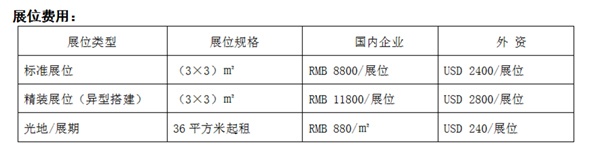 注:标准展位:三面围板(2.5m高)、楣板、射灯二支、洽谈桌一张、椅子二把220V插座一个。
